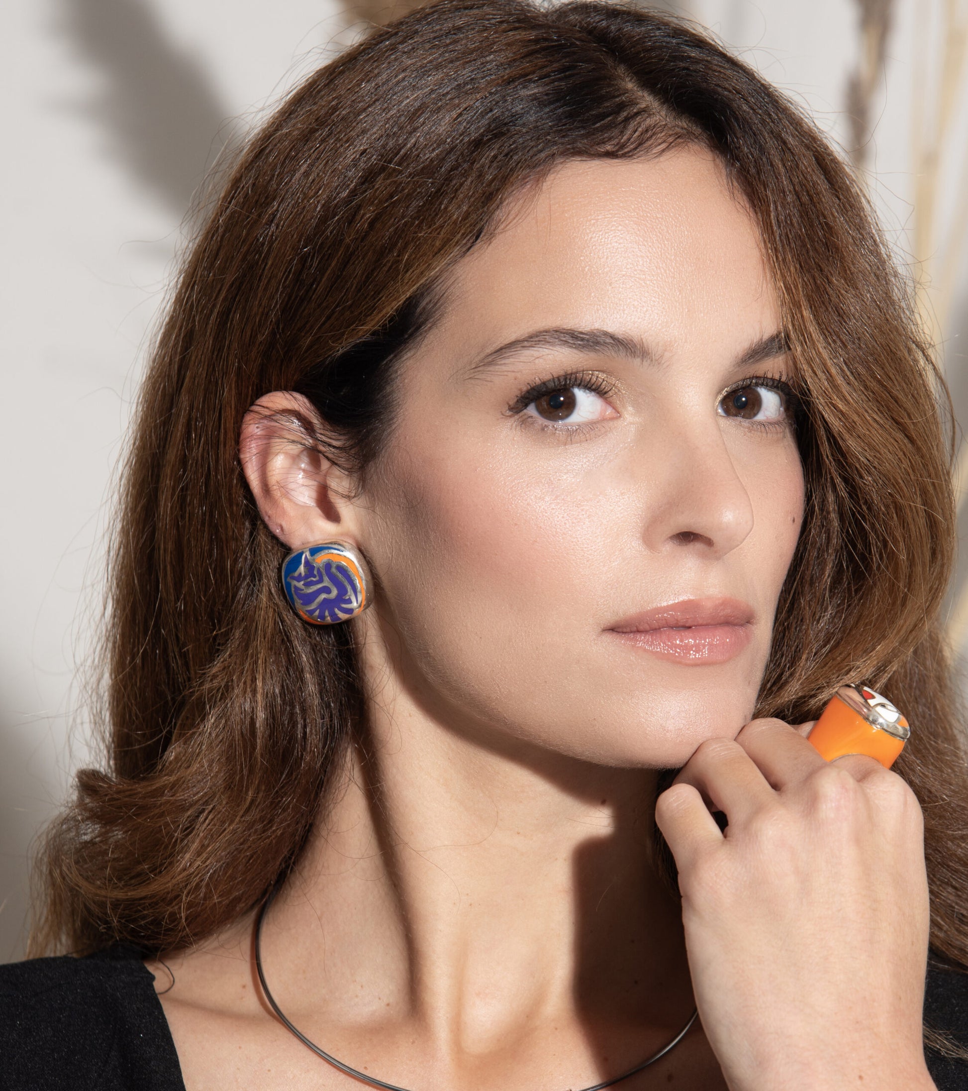 Orecchini con intreccio certosino e sapiente di metallo e colore, accostamenti sfacciati per creare un disegno romantico e moderno che genera un pattern a metà stada tra il passato e il domani.
